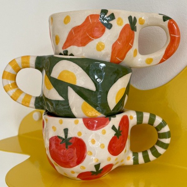 Set de 3 tazas de cerámica moldeadas y pintadas a mano. Aptas microondas y lavavajillas.