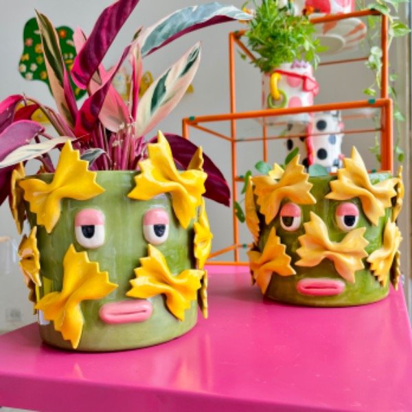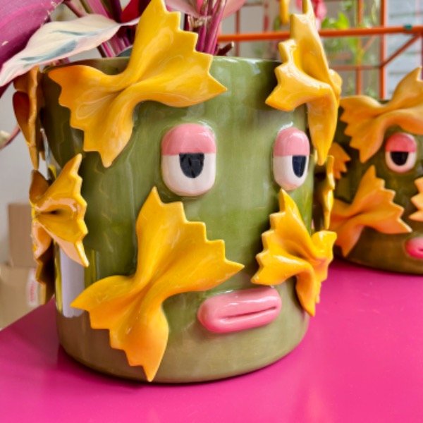 Maceta de cerámica con fideos moñitos imantados.
