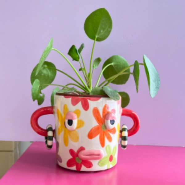 Maceta de cerámica pequeña con manijas y lentes decorativos.